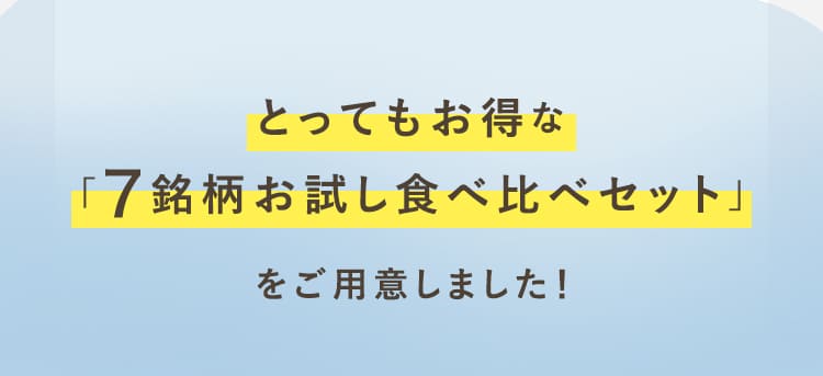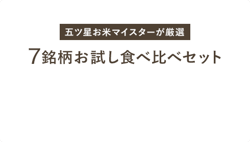 60kgコース 30kgコース いつでも新鮮なお米が楽しめる! まずは とってもお得な「7銘柄お試し食べ比べセット」をご用意しました! 7銘柄お試し食べ比べセット 商品写真 [家族でシェアできる][精米したての新鮮なお米][豊富な銘柄から選べる] 2,200円(税込)