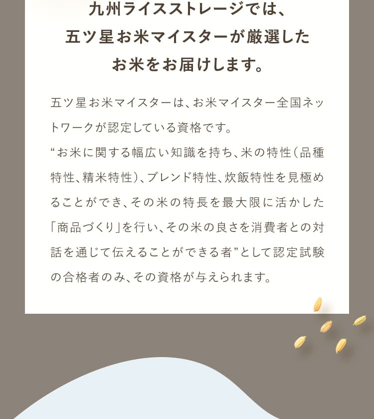 九州のお米はなぜ美味しい? 名水×恵まれた気候 自然に恵まれた九州だから さらに [Reason01]こだわりぬいた「鮮度」 写真 収穫から精米までの保管体制と設備 [低温倉庫で保管][配送依頼ごとに精米] [Reason02]常に美味しいお米を厳選 写真 味の見える化 五つ星 お米マイスター厳選!! [Reason03]「産地と作り手」の見える化 白河 ミネラル豊富な阿蘇の伏流水で徹底的に「美味しいお米」にこだわる 下野 農家と米卸会社の垣根を超えより美味しい米作り販売を目指す