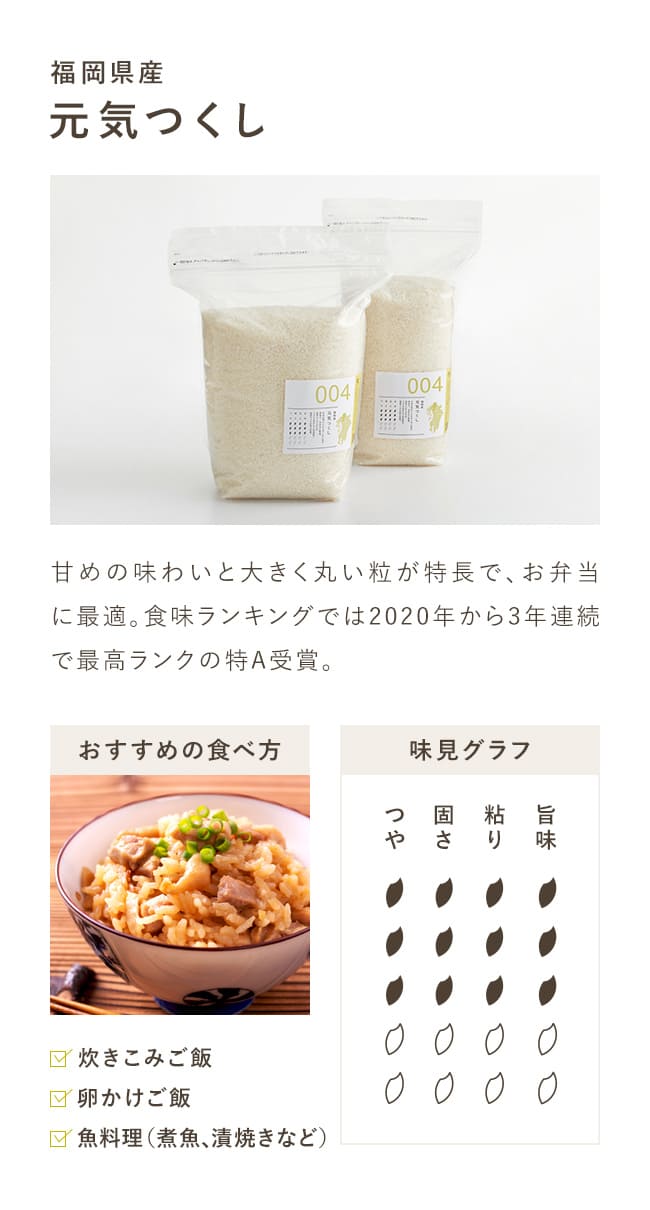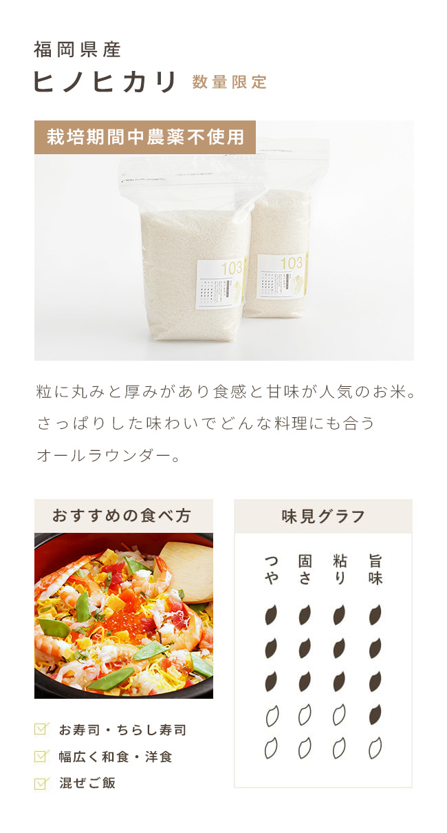 お米は生鮮食品なので、夏場は 2 週間、春秋は 1 ヶ月、冬場は 2 ヶ月を目安に、新鮮なうちに食べ切るのがおすすめです。いつも美味しいお米を食べるため、一度にたくさんではなく、少しずつまめな購入を推奨しています。